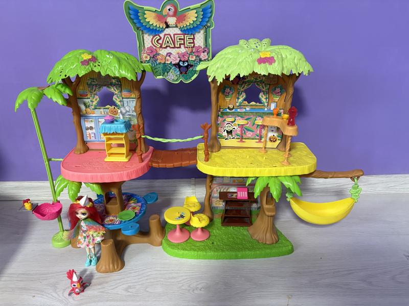 Кафе папуги Enchantimals в чудовому стані. Лялька та маленька папуга також. Аксесуари від кафе всі що на фото є. На задній стінці де не де приклеєні маленькі наліпки, але вони в очі не кидаються