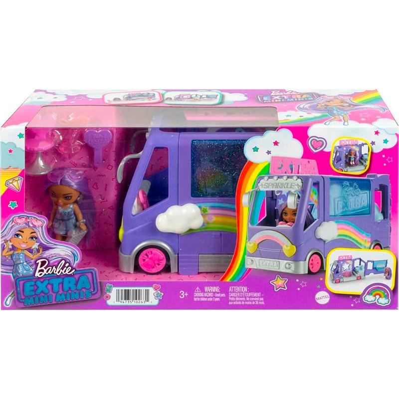 Малышки Barbie Extra Mini Minis умеют делать громкие заявления: они - неугомонные модницы, выражающие себя с помощью стиля. Они всегда стремятся к большему, дополняя свои образы аксессуарами. В туристическом автобусе Barbie Vehicle - несколько игровых зон, которые создают творческую атмосферу и увлекают в веселые игры. Автобус длиной 20 см имеет откидной багажник для хранения аксессуаров. На диванчике в виде облака поместятся три куклы Barbie Mini Minis. Яркости автобусу добавляют радужные детали и изображения звезд. В наборе с автобусом - кукла Barbie Mini Minis, ее одежда и аксессуары. Кукла одета в джинсовое платье со шнуровкой. Ее образ органично дополняют аксессуары: солнцезащитные очки в форме сердца, сережки в виде падающей звезды, сумочка, белые сапожки и расческа. Высота куклы Barbie Extra Minis Minis - 8,3 см. Туристический автобус Barbie Extra украшен белыми облаками, радугами и звездами Длина автобуса - 38 см. В автобусе есть откидной багажник для аксессуаров и косметический столик. Кукла Barbie Extra Mini Minis одета в джинсовый сарафан. Образ дополняют белые сапожки и аксессуары. В наборе с автобусом - кукла Barbie Extra Mini Minis, наряд, аксессуары и кукольный стульчик В игровом наборе: - Туристический автобус Barbie Extra Mini Minis Vehicle - Кукла Barbie Extra Mini Minis - Модный наряд - Пара обуви - Стульчик для куклы - Аксессуары: солнцезащитные очки, сумочка, сережки, расческа Длина автобуса: 20 см Высота куклы: 8,3 см Рекомендуемый возраст: 3+ лет