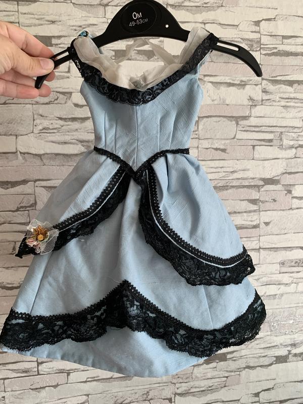 Плаття на ляльку,де не де є затяжки,довжина 36см,у поясі обхват 20см. Плаття має багатошарову спідницю, чорне мереживо по краю вирізу та на спідниці, а також невелику квіткову прикрасу збоку