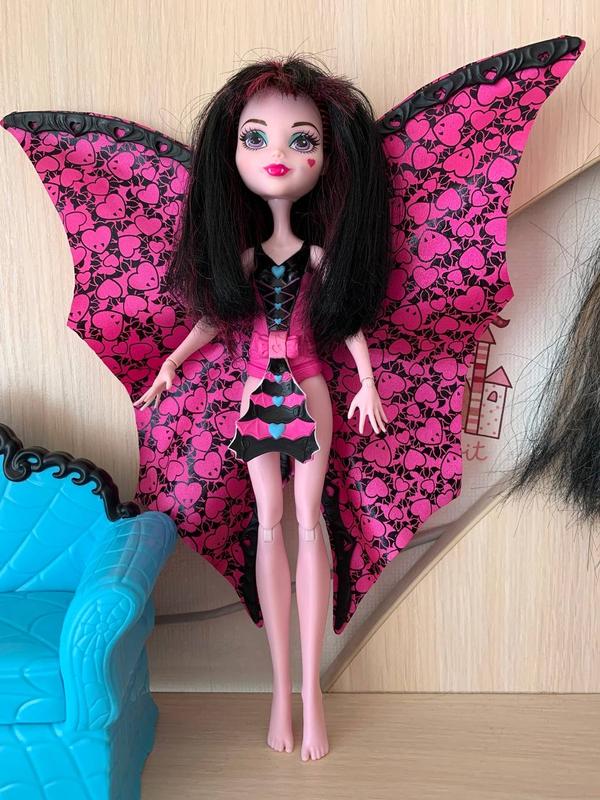 Monster High Draculaura Doll -Ghoul to Bat-Transformation Fold Out. Оригінал. Немає спіднички та взуття. Стан суперовий, на обличчі маленький нюанс, але не дуже помітно, в ціні враховано. Щарніри тугі, крила складаються. Окремо продається диван для ляльок Monster High. Якщо купити диван з лялькою тоді він коштує 100 грн, без ляльки диван 200 грн