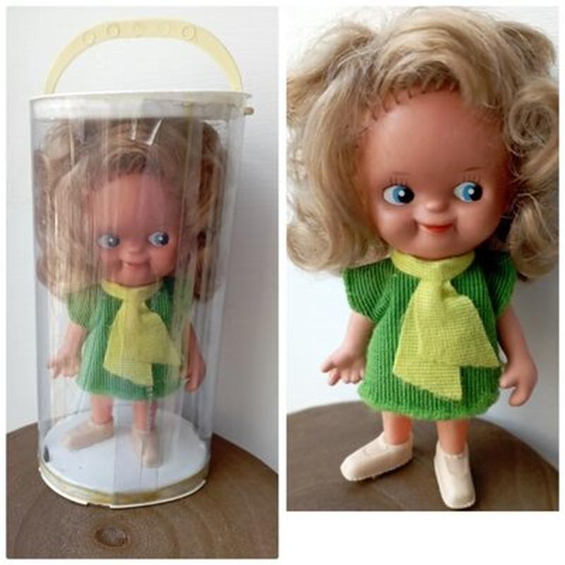 Кукла копытка в тубусе ГДР. Новая девочка, рост 14см, волосы длинные, с завитушками, повреждение тубуса. Торг небезопасен. Доставка за кордон.