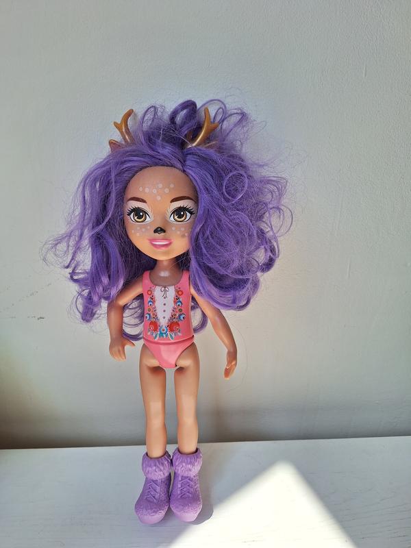 Продаю замечательную куклу из серии Энчандималс. Кукла в красивом состоянии, чистая и ухоженная, с ней играли бережно. Волосы густые, фиолетовые цвета. На голове рога, как у настоящей оленицы. На кукле яркий купальник с цветочным узором и фиолетовые сапожки. Особенности: обратите внимание, на правой щечке есть очень незначительное пятно (на фотографии ее хорошо видно). На игровой процесс это не влияет, но цена снижена. Размер: Высота куклы 31-35 см. Комплектация: Продается все, что вы видите на фото. Материал: Высококачественный пластик. Отлично подойдет для коллекции или для игр. Отстираю Новой Поштой или Укр-почтой, возможен самовывиз из Хмельницкого.