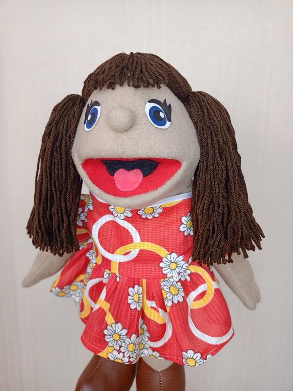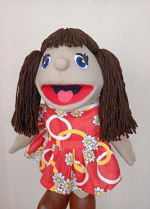 Дівчинка, лялька на руку з відкидним ротом. Ріст ляльки 40 см. Підходе для лялькового театру, вчителів, логопедів, вихователів та для ігр з дитиною вдома. Діти в ігрової формі краще навчаються та запамятовують.