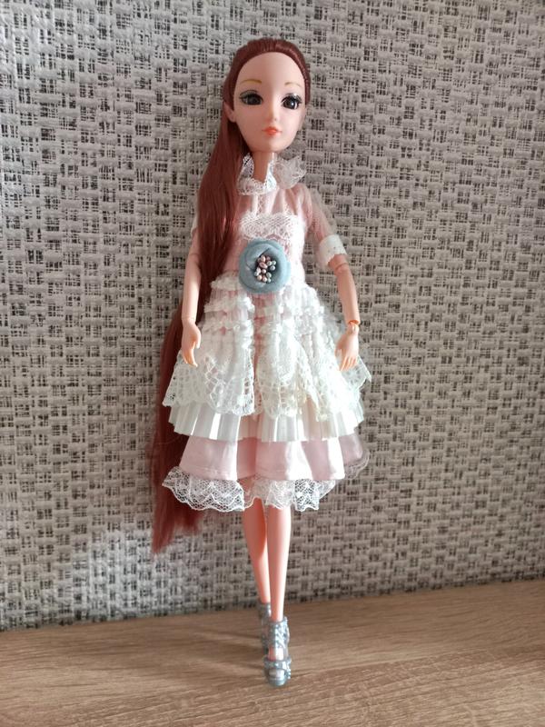 Кукла шарнирная ростом 30 см. С длинными волосами не густыми. Глаза вставные.