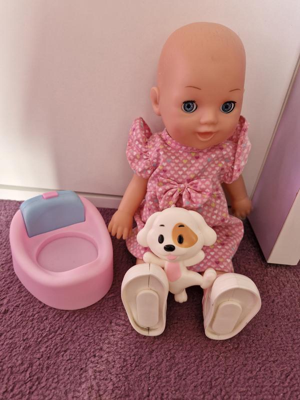 в хорошем состоянии, ранее 761, но упала и теперь не держит равновесие,mon можно поремонтировать- не пробовали, издает различные звуки ( очень похожие на настоящие), реагирует на погремушку, шевелит руками, в комплете погремушка и горшок с имитацией слива воды