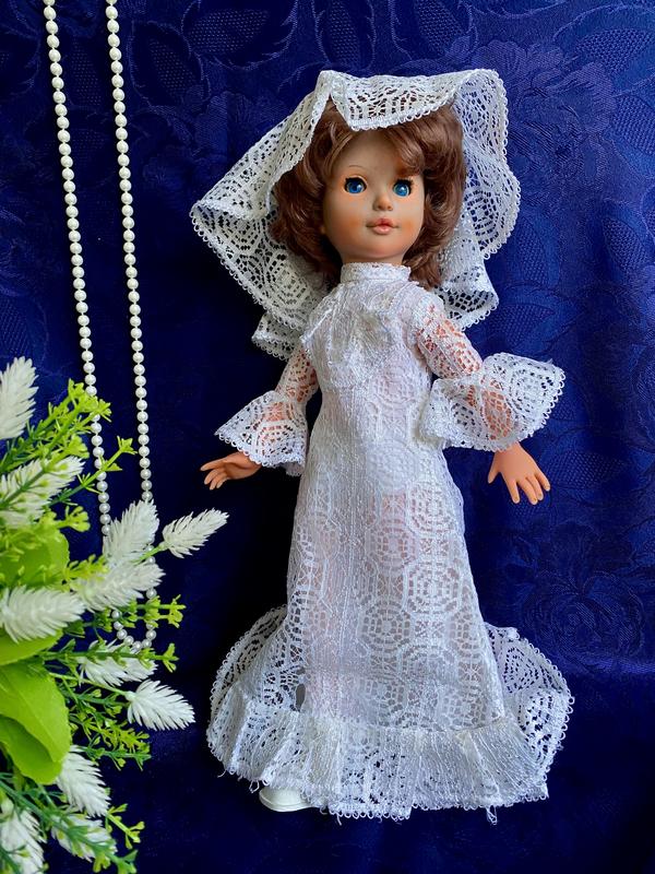 Вінтажний подих далеких 1970-х! Рідкісна красуня, мати на автомобілі яку мріяла кожна радянська наречена✨👰‍♀️✨ Лялечка від Plaho Steinach (або VEB Plast und Holzspielwaren Steinach) – це німецька фабрика, що існувала з 1900 року, яка спеціалізувалася на виробництві пластмасових та дерев'яних іграшок, зокрема ляльок та фігурок тварин. Середнього розміру, висота 45 см, тендітна жіночна фігурка з тонкою талією, вишуканою лінією долонь та незвичними рисами обличчя! Тіло і ніжки пластикові, голова і ручки з вінілу, волосся прошите, очки динамічні яскраво синього кольору! На шиї присутнє маркування. Повністю збережено автентичний одяг нареченої! ‼️А от вініл на обличчі лялечки час не пощадив, у деяких місцях його пошкоджено чорними плямами.