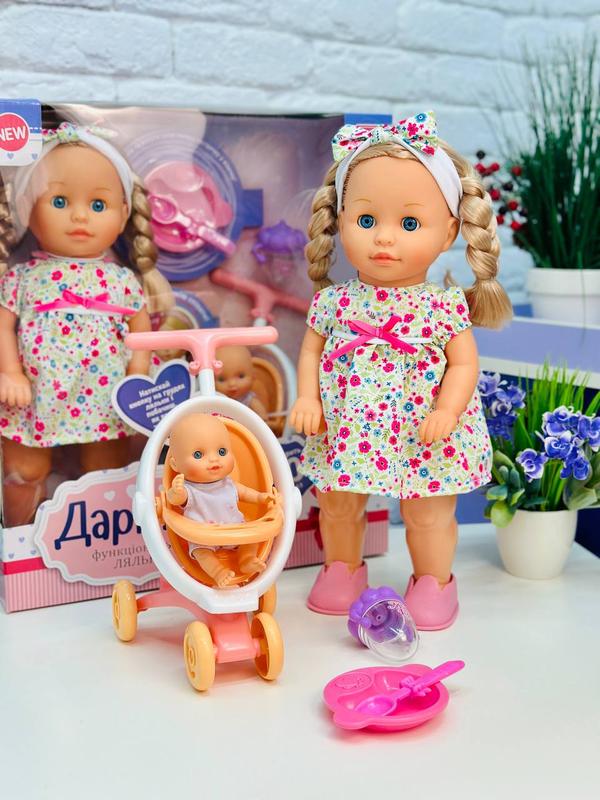 👩🍼 ЛЯЛЬКА ДАРИНКА: ХОДИТ С ВИЗОЧКОМ 👶 Артикул:2312 ❗️В наличии хитовая позиция❗️ Специально для заботливых девочек 🥰 С удобным тележком и аксессуарами так легко ухаживать за малышом! Даринка не просто хорошенькая - она настоящая умница и бережная старшая сестренка. 5️| 5 интересных функций 🗣 Разговаривает: говорит 10 фраз 🎶 Поет песенку 👣 Ходить! Переставляет ножки, как настоящий малыш 👩🍼 Умеет возить коляску с пупсиком, что делает игру еще более интересной 👶 В комплекте: миниатюрный пупс, коляска (29 см), посуда: тарелочка, ложечка и бутылочка. 👗 Изысканный наряд, красивая прическа, подвижные ручки и ножки 📏 Размер: 40 см