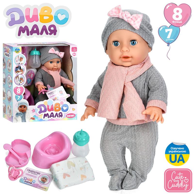 Милий функціональний пупс стане найкращим другом для вашої дитини та подарує безліч годин цікавих ігор. Лялька має ряд функцій, які роблять гру ще більш реалістичною: п’є з пляшечки, пісяє, відкриває та закриває оченята. У комплекті є всі необхідні аксесуари для догляду за малюком: свідоцтво (картка); горщик; пляшечка; пустушка; памперс. Пупс одягнений у гарний комбінезон та шапочку, що додає йому особливої чарівності. Розмір пупса: 35 см