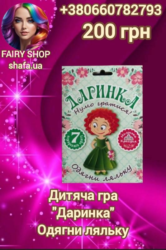 Купи какие бы 2 товары разных категорий из каталога интернет - магазина " Фейры Шоп" и получи женский парфюм в подарок! Детская игра " Даринка" надень куклу. Поклонные родители! Эта игра отличная возможность весело провести время со своим ребенком! Вы можете вместе вырезать одежду для куклы и переодевать ее в прекрасный наряд. Когда ребенок играет в эту игру, у него развивается моторика и формируется склонность к своему будущему индивидуального стиля. Кукла на подставке увлечет ребенка и развлечет его не на один вечер. Производитель: Украина Скорее меня покупай! Собирай и ребенку радость подари!