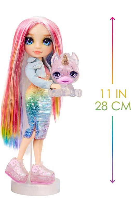 Вдохновляйте детей на творчество: откройте для себя любимых кукол Rainbow High и играйте с ними по-новому, волшебно. К каждой кукле прилагается особый домашний любимец, одежда, которую можно настроить, и набор блестящей слизи. ЧТО ВХОДИТ К КОМПЛЕКТАЦИИ: 11-дюймовая модная кукла с полным нарядом и очаровательными блестками на лице, настраивается обувь для куклы, настраивается сумочка, настраивается очаровательное домашнее животное с рогом, набор DIY Slime Kit - 1 упаковка порошка слизи + 1 пачка шиммера + 1 хрустальный шейкер для создания и хранения слизи.
