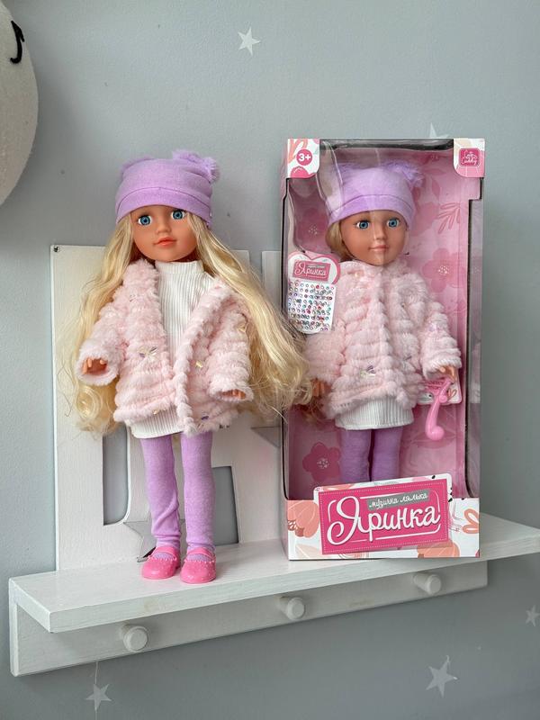 Лялечка одягнена у буде красивий одяг , а саме : рожева шубка, колготки , сукня, туфельки та шапочка Волосся у ляльки пришите та дуже якісне Ця красуня співає українською мовою, допоможе вашій дитині вивчити нові слова та розвинути музичні здібності