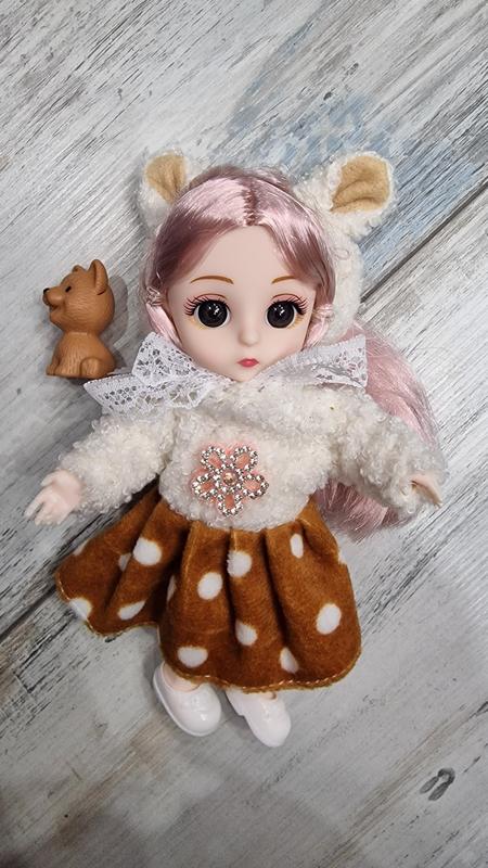 Кукла высота 16см, руки и ноги двигаются в 2-х суставах, голова поворачивается. Платье на липучке сзади, шапка и туфли снимаются. В комплекті собачка. Кукла не большая, хрупкая. Упаковка пакет. Кукла нова.