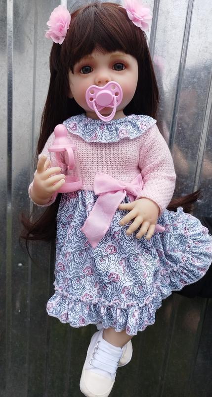 Виниловая кукла, выглядит как живая, прорисованная все детали и анатомические особенности. Имеет длинные блестящие каштановые волосы, из которых можно сделать любую прическу. Может стоять с опорой, сидеть, лежать, можно купать тело полностью виниловое, мягкое. Эта шикарная кукла станет отличным подарком для ребенка на любой праздник. Ее можно переодевать (подходит одежда 0-3 месяца). В комплекте свидетельство о рождении (можно вписать любое имя), магнитная соска, бутылочка, памперсы и одежду как на фото. Кукла полностью новая, не была в использовании.