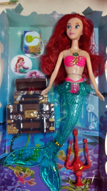 Музыкальная кукла русалка. У нее силиконовый хвостик, который, при нажатии на кулон начинает светится, который кулон тоже светится и в это время играет веселая музыка. В набор входит сундук с сокровищами, в котором сидит краб отшельник. Размер упаковки: 35х19 см.