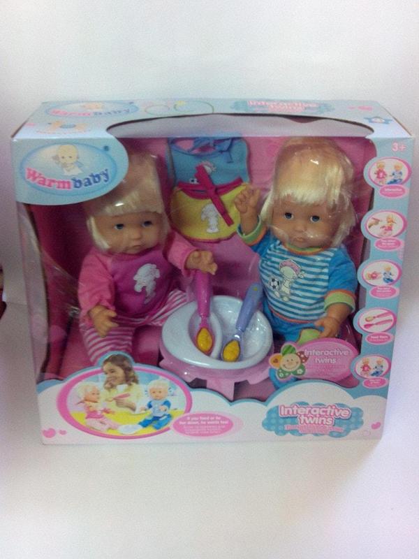 Два интерактивных пупса, работающие по принципу BabyBorn. В комплекте есть мальчик и девочка, а так же тарелка с ложечками и слюнявчики для каждого. Интерактивными пупсы называются не просто так, ведь они умеют говорить и плакать. Их можно кормить, а значит они ходят в туалет и даже спят! Пупсы хорошего качества, с прошитыми волосиками. Оба ребёнка требуют за собой должного ухода, а кормить их придётся несколько раз в день. Купить пупса и многие другие детские игрушки вы можете купить в интернет- магазине "Плюшево" с доставкой по всей Украине.