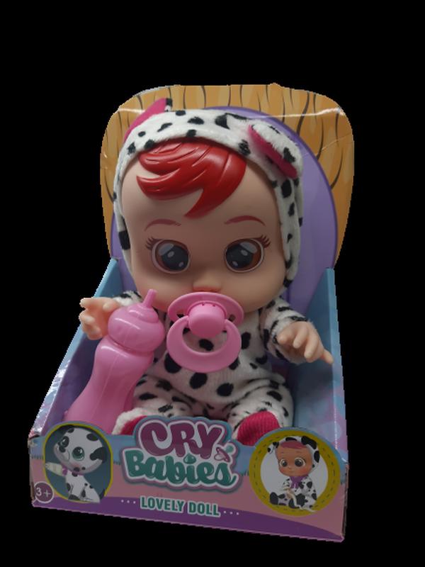 Пупс плакса высотой 28 см в пижамке Далматинца. Пупс - мальчик! Издает звуковые эффекты - плачь, зовет папу или маму, хнычет. Льются слезы, есть бутылочка. Элементы питания в комплекте и уже установлены.