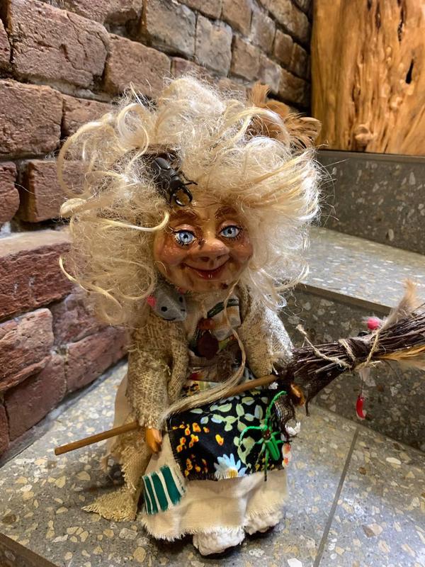 Высота-37 см Ширина-40 х 17 см Глубина-18 см Баба-Яга - мифологический персонаж, распространенный в славянском фольклоре. Прежде фигурирует в сказках, но также встречается в детских играх. Традиционным изображением является старая женщина, атрибутами которой является домик на курьих ножках и ступа. Баба Яга создана из разных материалов (керамика, текстиль, дерево и т.п.) и в разной технике. Уникальная кукла, создана полностью вручную, авторская работа.