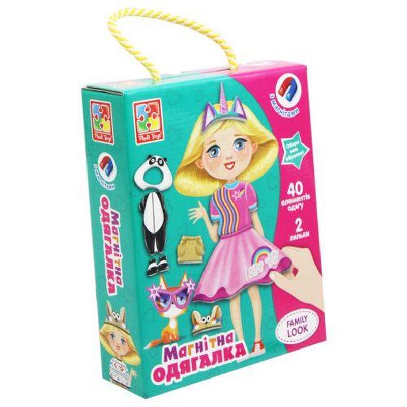 Магнітна одягачка "Family look" складається з 40 елементів одягу. За допомогою набору дитина зможе одягати персонажа на свій смак. Одяг виготовлений як м'який магнітик, який прикріплюють до ляльки. _ Бренд: Vladi Toys Паковання: Коробка Колір: Різнобарвний Вага в упаковці: 370 г Габарити в упаковці: 22.5 x 18 x 5 см Страна виробник: Україна Матеріал: Комбінований Комплектація: 2 ляльки, 40 елементів