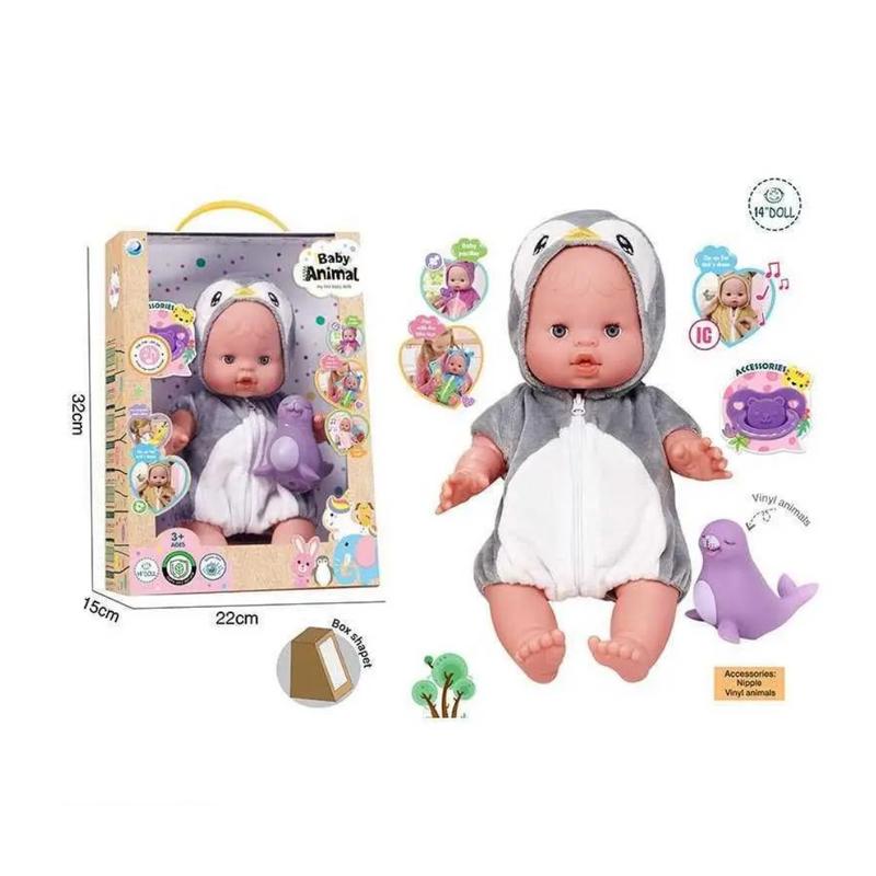 Особенности: - кукла с отличной детализацией; - имеет изощренные черты лица; - одетая в съемную одежду; – имеет анатомически правильные пропорции тела; - пьет из бутылочки; - ходит на горшок; - закрывает глаза; - тело куклы выполнено из пластика, а голова и конечности – из плотной резины; - высота – 40 см. Комплектация: - кукла; - горшок; - подгузник; - пустышка; - бутылочка; - карта младенца.