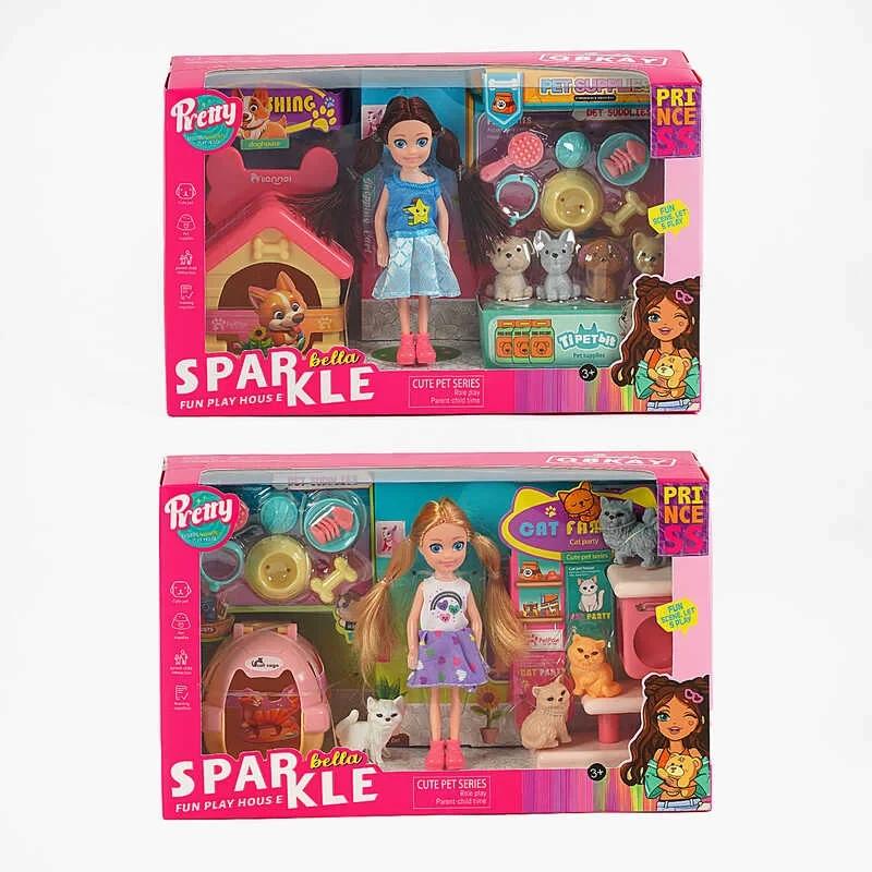 Кукла 7018 (48) с четырьмя питомцами и аксессуарами в коробке, 2 варианта, высота 13 см