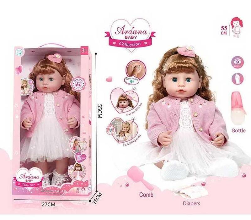 Жива інтерактивна лялька для дітей Ця гумова лялька висотою 52 см створена для захоплюючої гри та розвитку турботи у дітей. Вона має прошите шовковисте волосся, рухомі руки та ноги, а також заплющує очі, що додає реалістичності. Лялька оснащена інтерактивним модулем, який реагує звуками на зміну положення і допомагає навчитися догляду через гру. - Виготовлена зі щільної гуми - Рухомі напівзігнуті кінцівки - Функція заплющення очей - Інтерактивний звуковий модуль на спинці - В комплекті: пляшечка, памперс, щітка для волосся, стильний знімний одяг - Висота ляльки: 52 см - Ходить на горщик, сприяє розвитку навичок догляду