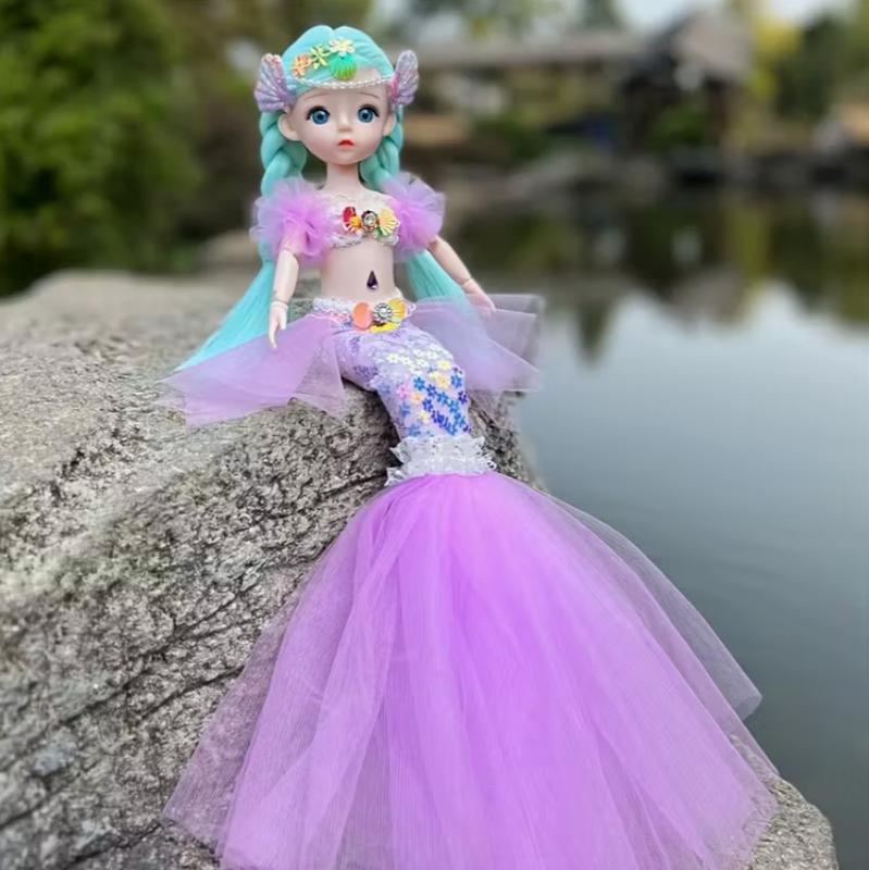 Большая нарядная кукла русалочка 45 см Очаровательная кукла Русалочка -- мечта для любителей сказок! Эта кукла в образе русалки покоряет с первого взгляда: длинные бирюзовые волосы заплетены в косы и украшены морским ободком с ракушками и звёздочкой. Её наряд -- это волшебство: блестящий топ с камнями и роскошный хвост с чешуйками, завершающийся пышным фиолетовым фатином. Кукла идеально подходит для игр, фотосессий и подарков. Погрузитесь в мир фантазии вместе с ней!