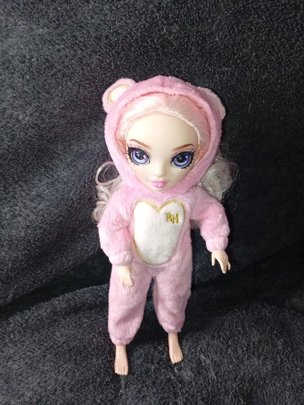 Это кукла Rainbow High Junior High PJ Party Белла Паркер (Bella Parker). Бренд: Rainbow High. Серия: Junior High PJ Party Fashion Dolls. Персонаж: Белла Паркер. Особенности: Кукла одета в розовый плюшевый комбинезон с капюшоном и надписью "RH" на груди. Назначение: Рекомендовано для детей в возрасте от 4 лет.