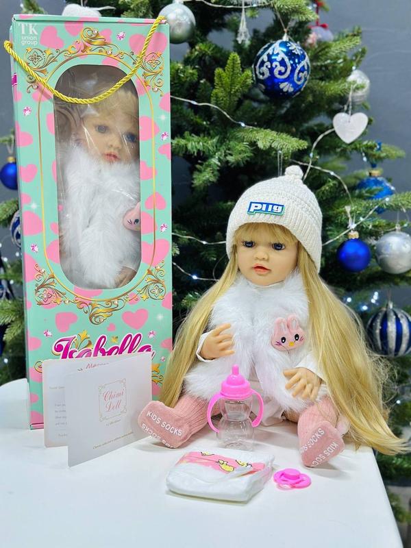 Зріст 50 см — ідеальний для обіймів! Матеріал:Виготовлена з високоякісної вінілу для довговічності та безпеки. Реалістичні очі: Імітація скляних очей додає ляльці особливого шарму. Пишне волосся: Довге, густе та прошите волосся легко розчісується, дозволяючи створювати безліч зачісок. Аксесуари в комплекті: Магнітна пустушка, памперс, пляшечка, капелюшок та шкарпетки — все для захопливої гри! 🎁 Подарункове пакування: Лялька постачається у красивій подарунковій коробці, що робить її чудовим варіантом для презенту