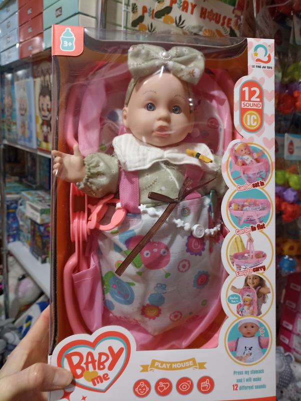 Пупс Baby Me Play House від Le Ying Jar Toys. Він видає 12 різних звуків. Може сидіти або лежати рівно. Легко носити завдяки переносці. Призначений для дітей віком від 3 років