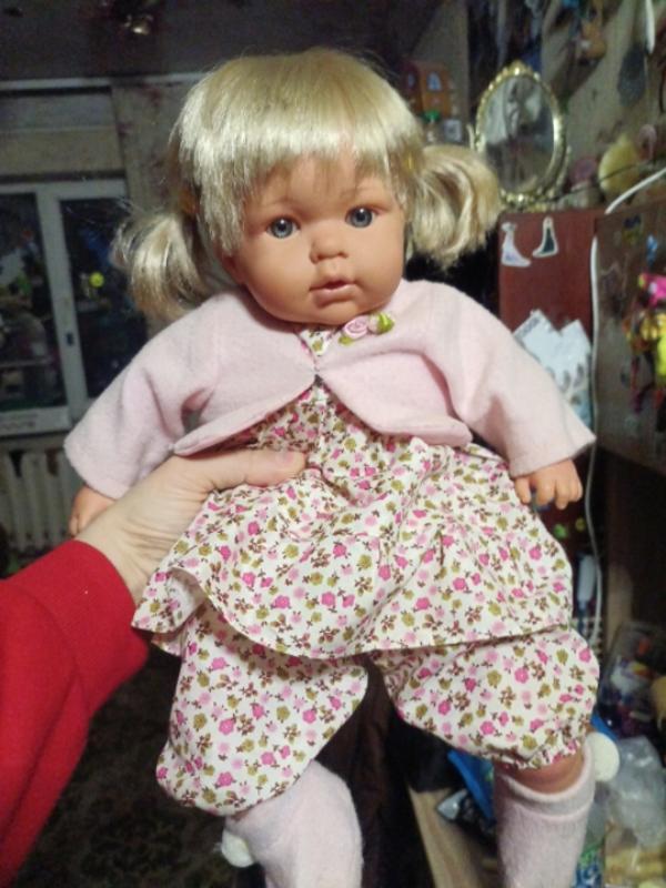 Кукла пупс мягконабивная, длина 45 см, сзади есть пластиковая коробочка с батарейками следует заменить, говорит мама, плечо и смеется. На последнем фото показала похожую куклу из интернета и ее цена.