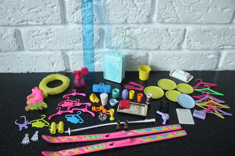 Лот мелкоты для Барби и не только. Продукты, аксессуары, вешалки, еда и т.д. Есть винтаж. Состояние красиво. ролики светятся, если быстро ехать. 2 бокала коричневые металлические Цена за все - 390 грн
