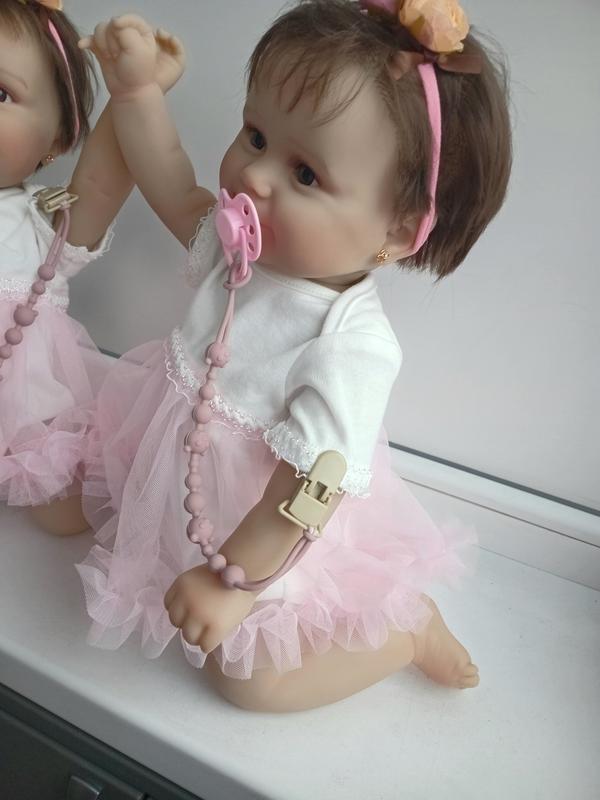 Очень хорошего качества виниловые реборны.Высота 50см,волосы прошиты,мягкие,их много.Имеет признаки девочек.Глазки вставлены,соска на магеите.Имеет милое боди платье,памперс,бутылочку,соску с держателем,повязочку и свидетельство.Винил люкс качество,гиперолерген.Цена куколки 2000