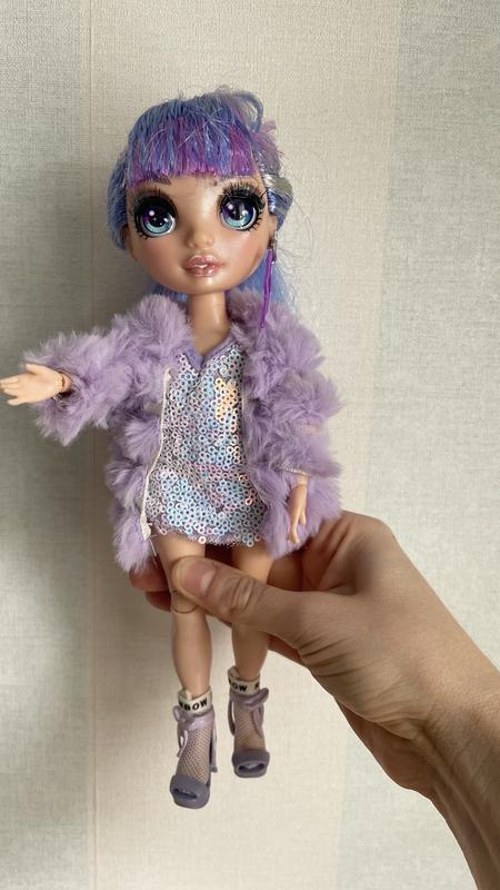 Violet Willow Rainbow High Dolls У наборі: • 2 комплекти одягу • 2 пари бузкових туфель • сукня • куртка • гребінець • 2 вішаки • підставка для ляльки Висота ляльки — близько 30 см. Все в ідеальному стані. Дитина фактично не гралась