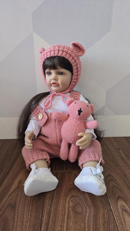 Ручки и ножки подвижные, кукла может сидеть и лежать. Соска на магнете, бутылка и памперс в комплекте. Характеристики: Вес: 1,6 кг Рост: 56 см (учитывая анатомические изгибы) Пол: девочка Тело: винил-силионовое Глаза: открытые, не закрываются Волосы: парик Отдельно в продаже колясок, кровать с постолью и одежда, купленная отдельно (смотрите фото в объявлении)