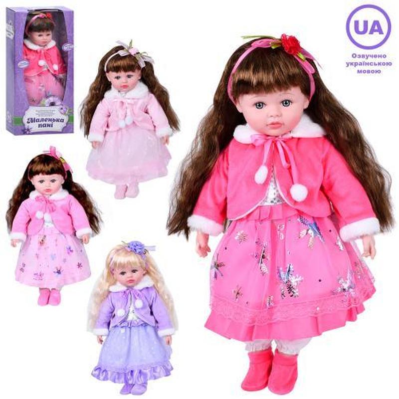 Лялька м'яконабивна "Маленька пані", 45 см, 4 види. Озвучена українською мовою. Музика, звуки. Іграшка співає пісні. Живлення - батарейка типу таблетка. Упаковка - коробка. Розмір - 23,5х12,5х49 см.
