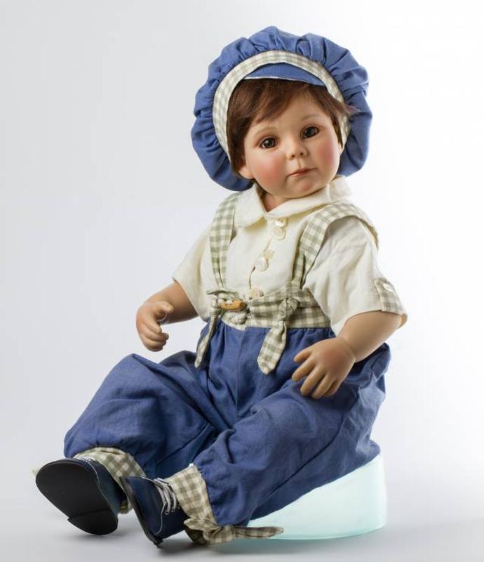 Привет, я JUNIS! - виниловая кукла из известной лимитированной коллекции "Master Piece Gallery" немецкого мастера Gerlinde Feser. Очень забавный и шкодный кареглазый малыш уже собрал свой рюкзачок, чтобы поехать в гости к бабушке в деревню. Голова, руки, ноги и половина торса - винил, имеет нагрудную пластину (с предплечьем), тело от пояса мягко-набивное, утяжелённое. Ножки почти полностью из силикон-винила, в ручках каркас, голова поворотная на шарнирах. Волосы каштановые (натуральные, парик), карие глазки (стекло) с пушистыми ресничками. Родной аутфит: комбинезон, рубашка, берет и рюкзак из льна, на ногах белые носочки и ботиночки, даже одет в памперс, есть сеточка для волос. Лимитированный тираж всего 500 кукол на весь мир, регистрационный номер 048. Есть паспорт-сертификат, клеймо на голове и чек о покупке. Возраст Junis 23 года, рост 65см. Куплен в Германии для коллекции, состояние идеальное. Коллекционная кукла, произведенная знаменитым автором, со временем превращается в настоящую семейную реликвию, порой передаваемую из поколения в поколение. Доставка Новой почтой с предоплатой на карточный счёт. Стоимость доставки по расценкам перевозчика Вы оплачиваете при получении посылки.