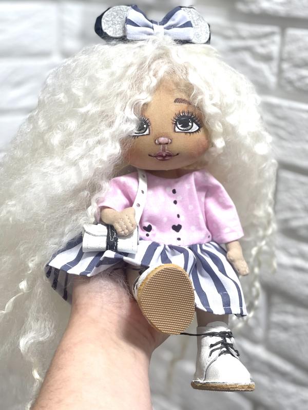Лялечка ручної роботи, зростом 27 сантиметрів. Може бути як інтерєрною так і ігровою, самостійно стоїть у взутті, одяг, взуття знімаються. Можна переодягати та роботи зачіски.
