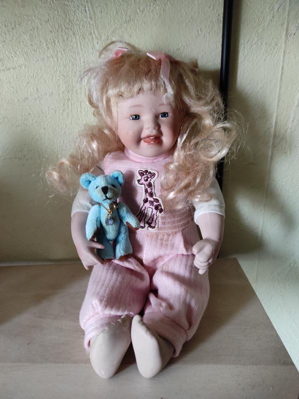 Интерьерная, колекционная ,винтажная фарфоровая кукла .Тело набианое,волосы паричок,мишка-игрушка в комплекте , состояние отличное, хранение на полке
