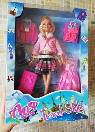 Комплектация: кукла в топе, юбке и кофтине, платье, босоножки, солнцезащитные очки, серьги, сумочка, паспорт, дорожный чемодан, аксессуары по уходу за волосами Особенности: Для девочек от 3 лет; Серия: Путешествие; Высота куклы 28 см; Кукла с вещами для путешествия; Материал: пластик, текстиль; Размер коробки: 23 х 5 х 32,5 см.