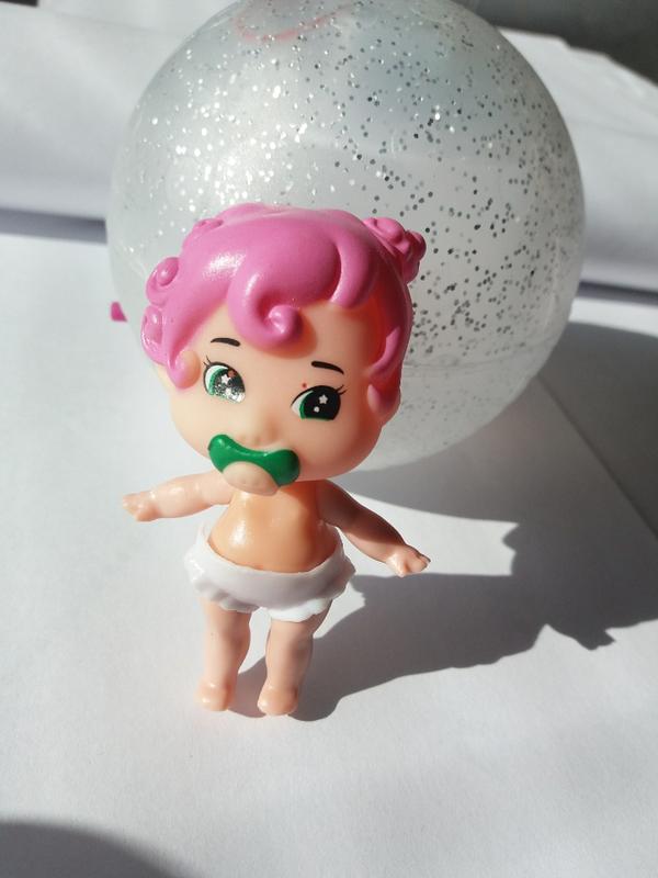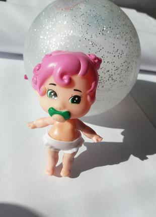 Лялечка в пластмасовому кулі-сумочці. Сумочка з блискітками, на батарейках, світиться - моргає. Трусики-памперс знімаються. Лялька плаче. під час купання, вода потрапляє в голову і з очей течуть сльози. Діаметр кулі 31см.