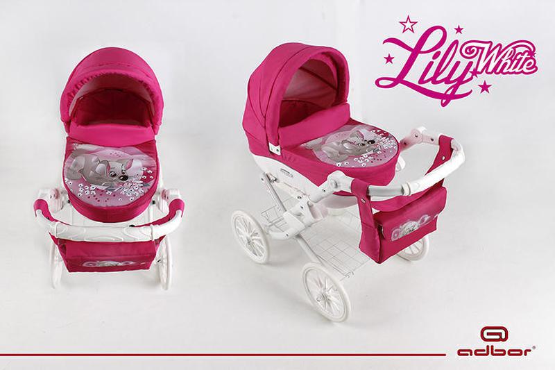 Adbor Lily - дает возможность каждой малышке почувствовать себя настоящей мамочкой. Современная конструкция рамы и легкие колеса добавляют маневренности.Преимущества и оснащение коляски: Легкие, пластиковые колеса;Ручка с регулировкой высоты;Пластиковая люлька;Регулируемый капюшон;Чехол для ножек крепится с помощью магнита;Матрасик в люльке;Сумка, которую можно закрепить на ручкеПодвеска с задней системой амортизации;Бесплатно:Рама с колесами;Люлька;Корзина для покупок;Сумка для покупок;Размеры коляски:в разложенном виде: 70*42*75 см;в сложенном виде: 72*42-34 см;высота до верха капюшона: 75 см;внутренние размеры люльки: 54*26*15 см;высота ручки (от земли): 35-70 см;сумочка: 18*25*8 см;диаметр колес: 17 см.вес коляски: 4,3 кг.