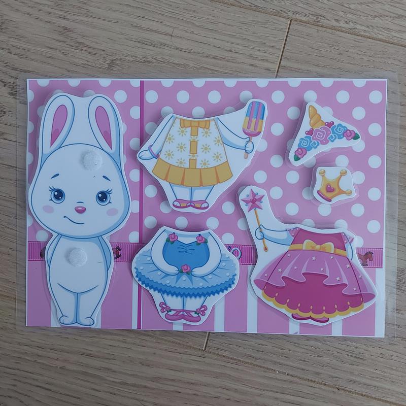 розвиваюча гра "Зайка з одягом" до складу входить: - основа А5 ламінована - ламінований зайчик на липучках - 3 плаття - 2 корони для голови. Можна скомбінувати декілька сторінок в 1 книгу. Вартість 1 сторінки 60 грн.