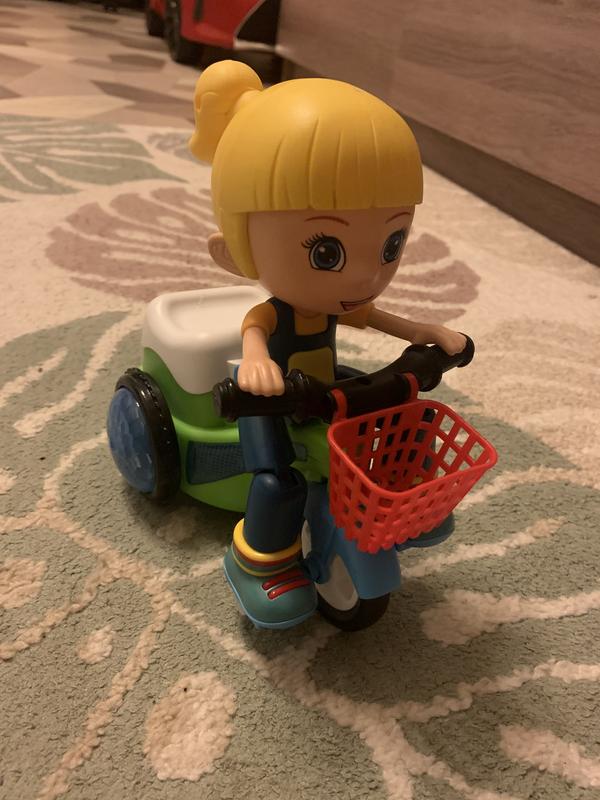 В новом состоянии, ездит коляска крыться , становится на задние колёса и врубится во круг , ездит и играет мелодия. Куколка снимается , во время езды ножки и ручки крутятся как при езде на велосипеде