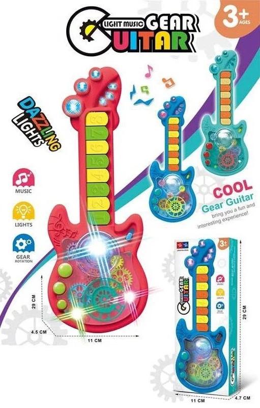 Ця гітара не схожа на звичні нам музичні інструменти, вона може створити навколо себе справжню чарівну атмосферу, яка обов'язково сподобається малюкові, дитина виявиться у світі музики та яскравих світлових ефектів. Особливості: - гітара має 2 режими роботи: відтворення нот і мелодій; - 8 функційних кнопок; - іграшка працює від 3 батарейок типу "АА" (не додаються); - в процесі функціонування іграшка підсвічується різнобарвним світлом; - режим програвання мелодій супроводжується рухом шестерень і проєктором; - обладнана зручним ремінцем; - оригінальний дизайн із шестереньками -розміри вказані на фото
