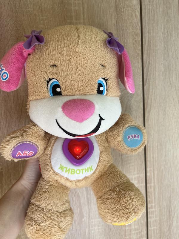Fisher price цуценя з технологією Smart Stages (укр.мова) Рівень 1 - Досліджуємо – 6 міс.+ Досліджуючи та натискаючи на іграшку, дитина слухатиме веселі звуки, перші слова та пісні! Малюк вивчає частини тіла цуценяти і знаходить їх. Рівень 2 - Заохочуємо – 12 міс.+ На цьому рівні малюк вчитиметься рахувати, розпізнавати кольори та визначати частини тіла, а також із задоволенням рухатиметься. Іграшка заохочує до дії запитаннями та простими підказками. Рівень 3 - Уявляємо – 18 міс.+ Коротко про головне: Лапки, животик, вухо та серце цуценяти реагують на дотик дитини (усього 7 інтерактивних точок). Іграшка доступна українською та російською мовами. Іграшка оснащена технологією Smart Stages™ — навчальний рівень змінюється з віком малюка, пропонуючи 3 рівні гри! Знайомить дитину з частинами тіла, літерами, кольорами, цифрами і не тільки. Допомагає розвивати органи чуття та дрібну моторику. Для роботи необхідні 3 батарейки АА. Вік: від 6 мiсяців Мова: українська Живлення: 3 батарейки тип AA Розмір упаковки: 33 x 28 x 16 см Вага в упаковці: 620г Виробник: Fisher Price