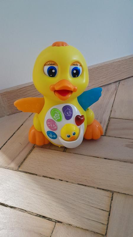 Уточка имеет 7 замечательных мелодий, а также двигается и меняет свое направление, что очень нравится малышам. ребенок окружала эту игрушку. состояние идеальное, все работает.