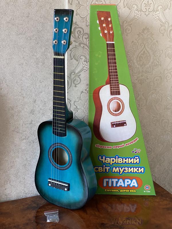 Така гітара з медітатором обов’язково сподобається юному музиканту. Класична акустична шестиструнна гітара. Містить металеві струни, шпильки, які регулюють натяг струн. Довжина гітари 58 см . В комплекті запасна струна . Розмір упаковки 59-21-7 см