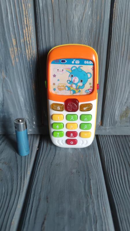 Имеет кнопку вкл/выкл, множество различных звуковых эффектов, подсветки, звук камеры, мелодии и переливается экран. Работает от батареек нюанс: есть немного потертости