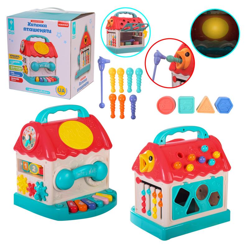 Музыкальная игрушка Домик птенца, лабиринт, счет, орган. Домик птенца - музыкальная игрушка выполнена в виде домика с 4-мя игровыми панелями и удобной ручкой для переноски на крыше. На каждой стороне дома установлены оригинальные игровые панели, каждая из которых направлена на развитие определенных навыков ребенка. Домик содержит: - музыкальное пианино, - барабан, - сортер с геометрическими фигурами, - игру Накорми птенца, - счета и вращающиеся шестерни. Играя, малыш сможет развить мелкую моторику рук, внимательность, воображение. Озвучено на украинском языке. Работает от трех батареек типа АА в комплект не входят. Размер игрушки: 20,5х19,5х24 см. Размер упаковки: 23,5х21х25 см. Упаковка коробка. Внимание. Производитель оставляет за собой право изменять комплектацию, цветовую гамму и характеристики товара без предварительного уведомления. После оформления заказа мы свяжемся с Вами в течение 2-х часов и если у Вас возникнут вопросы, мы с радостью на них ответим.