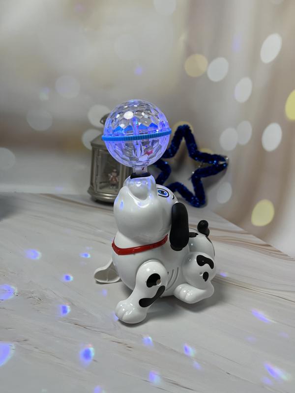 ИНТЕРАКТИВНЫЙ ПЕСИК - ТРЮКАЧ С МУЗЫКОЙ И СВЕТОМ Интерактивная игрушка для малышей от 1 года. Она очень милая и веселая, может выполнять много функций: крутится, садится, ходит. Во время игры звучит музыка, а шар на носике светится разными цветами. Размер упаковки: 13 x 9,5 x 12 см Работает от 3-х батареек типа АА (нет в комплекте).